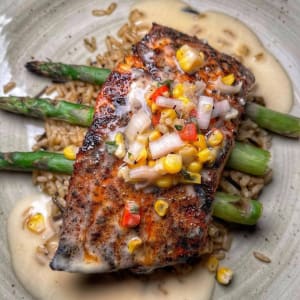 - Blackened Salmon: Wild Rice, Asparagus, Tomato and Roasted Corn Salsa. Shallots. Lemon Butter Sauce